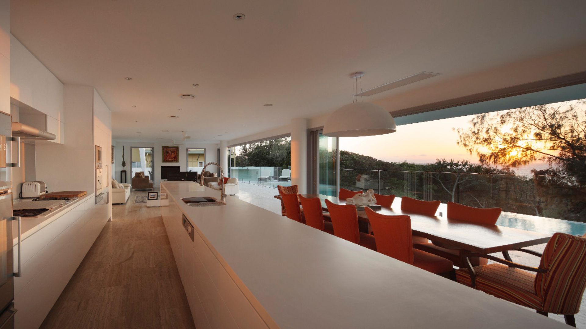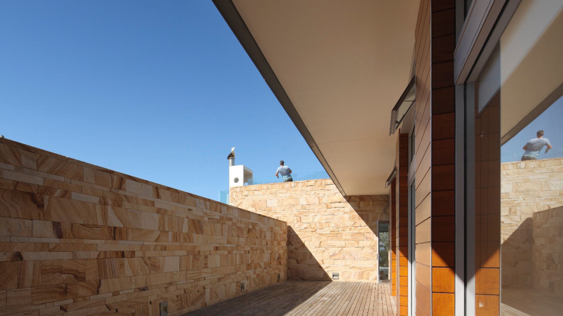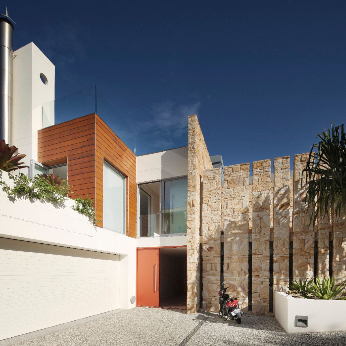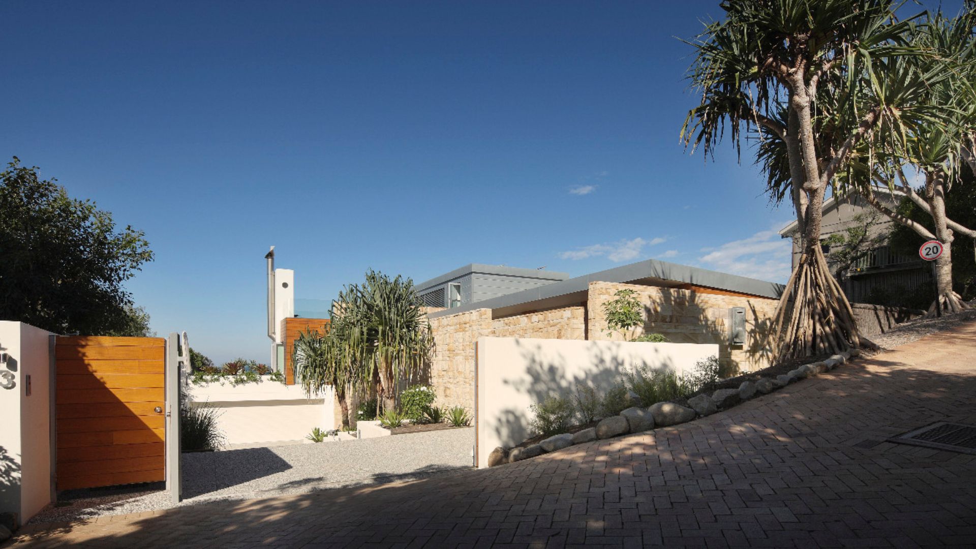 Sunshine beach house in Queensland was completed in late 2011 designed as a singular family home for its owner returning from overseas. Located on Sunshine coast’s longest and best surf beach with year-round sunny weather, the two-storey house with a partial lower level consists of 3 volumes. The house is designed with the sub tropical climate in mind as well as passive cooling and heating. Sandstone feature walls screen direct and guide visitors to the arrival as well as protect and screen. A “barcode” wall screens entrance from northerly neighbours and the solid walls run parallel forms the winter court to the bedroom block; other such walls screen and frame vignettes to the ocean from all bathrooms. Large seamless living and dining block runs north south facing out to the easterly (ocean) view opens out onto a sundeck and pool absorbing dramatic Noosa sunrise and Pacific Ocean. Large expanses of decks to the North and roof top allow for entertaining guests all year round. All sundry spaces and hallways are designed to attain natural daylight and a hierarchy of alcoves to display owner’s extensive South East Asian art and sculpture collection.