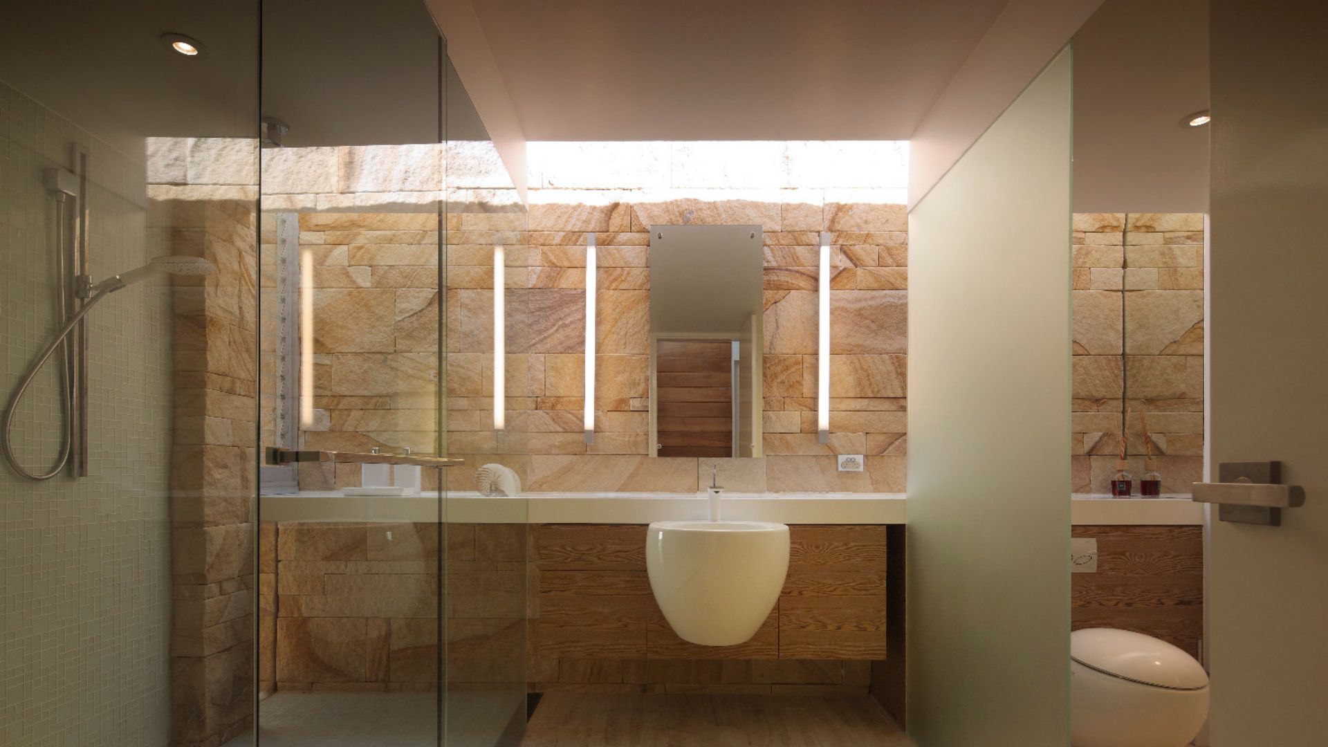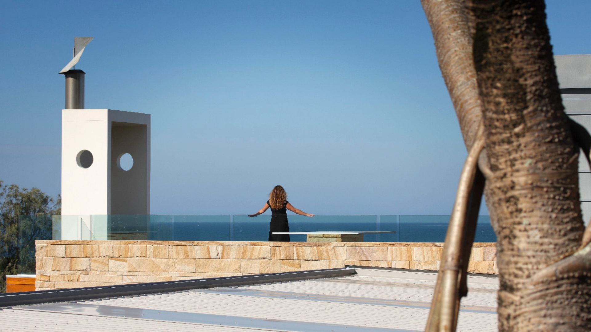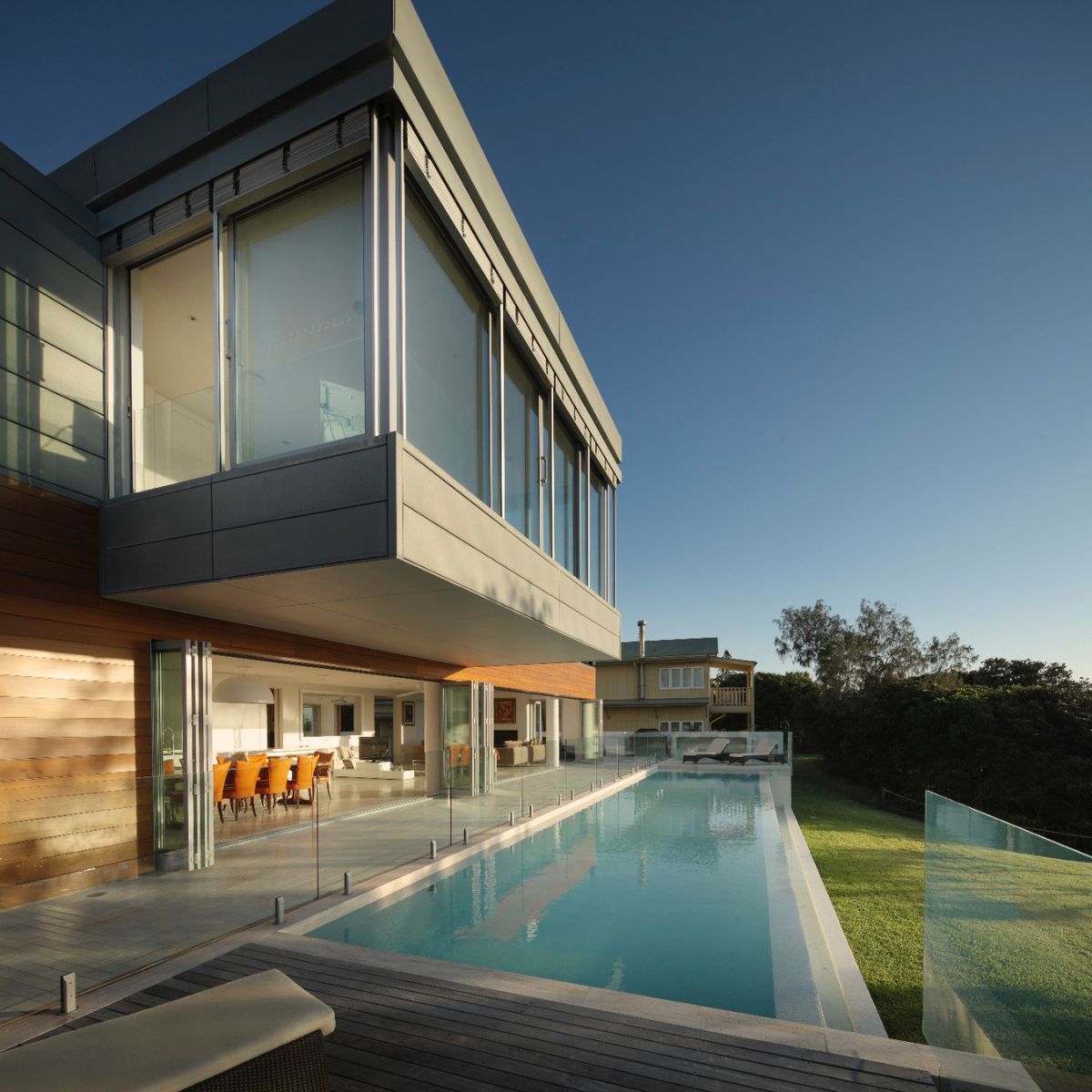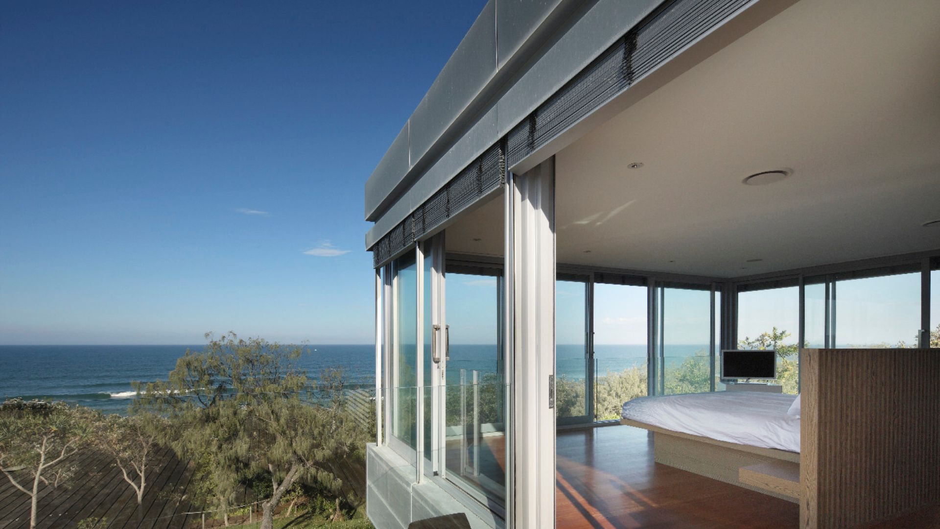 Sunshine beach house in Queensland was completed in late 2011 designed as a singular family home for its owner returning from overseas. Located on Sunshine coast’s longest and best surf beach with year-round sunny weather, the two-storey house with a partial lower level consists of 3 volumes. The house is designed with the sub tropical climate in mind as well as passive cooling and heating. Sandstone feature walls screen direct and guide visitors to the arrival as well as protect and screen. A “barcode” wall screens entrance from northerly neighbours and the solid walls run parallel forms the winter court to the bedroom block; other such walls screen and frame vignettes to the ocean from all bathrooms. Large seamless living and dining block runs north south facing out to the easterly (ocean) view opens out onto a sundeck and pool absorbing dramatic Noosa sunrise and Pacific Ocean. Large expanses of decks to the North and roof top allow for entertaining guests all year round. All sundry spaces and hallways are designed to attain natural daylight and a hierarchy of alcoves to display owner’s extensive South East Asian art and sculpture collection.
