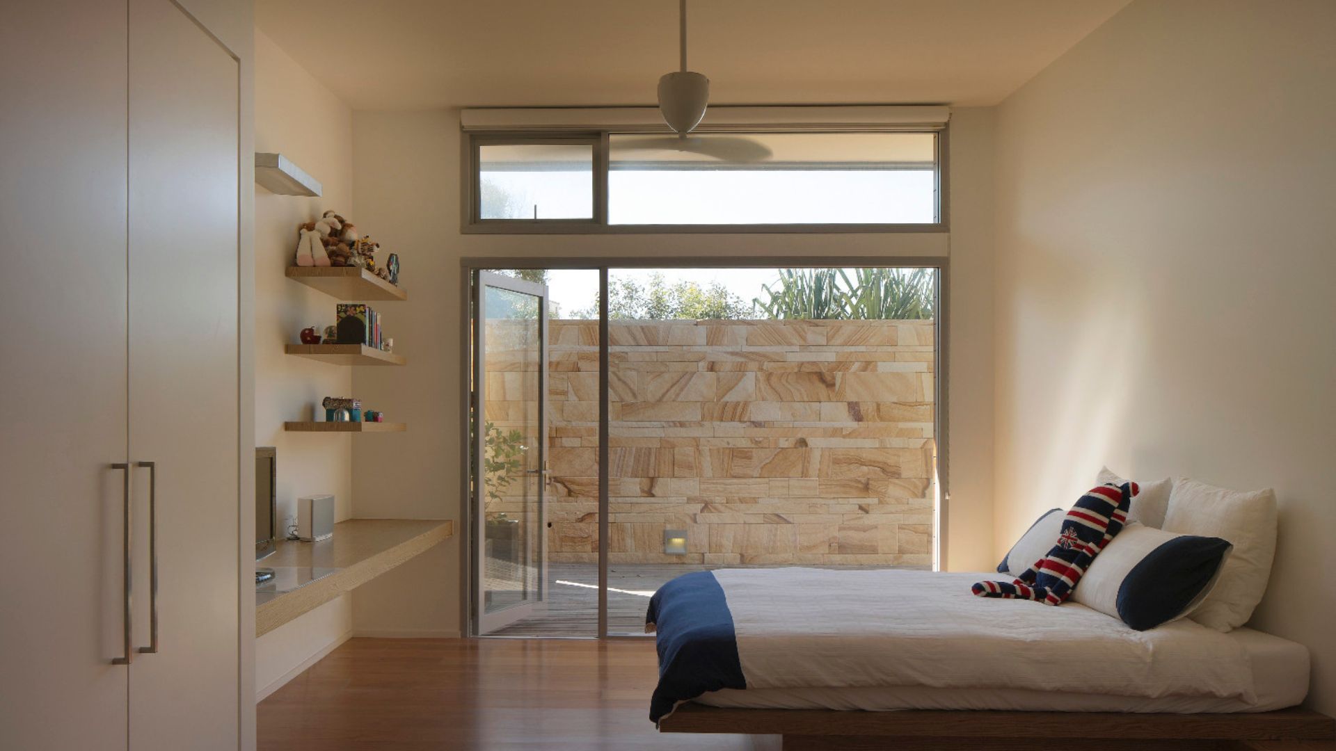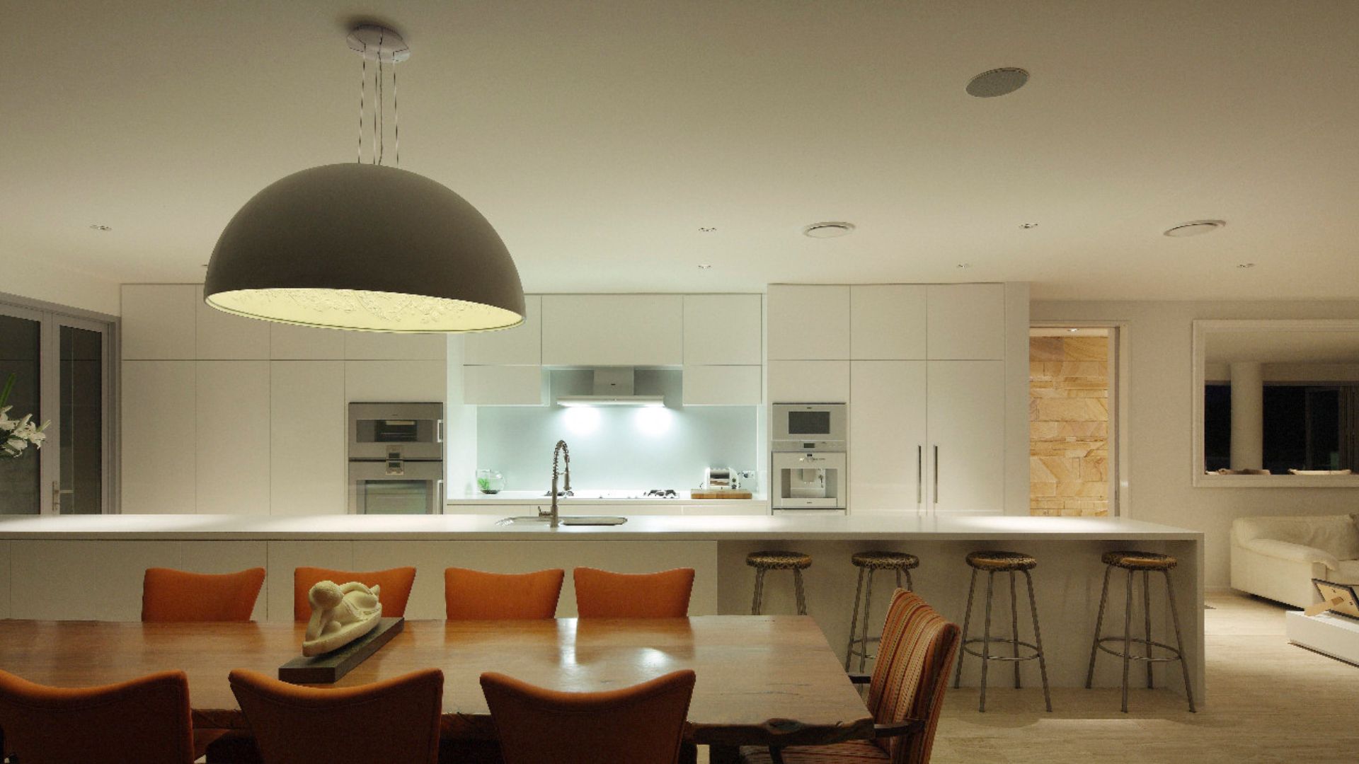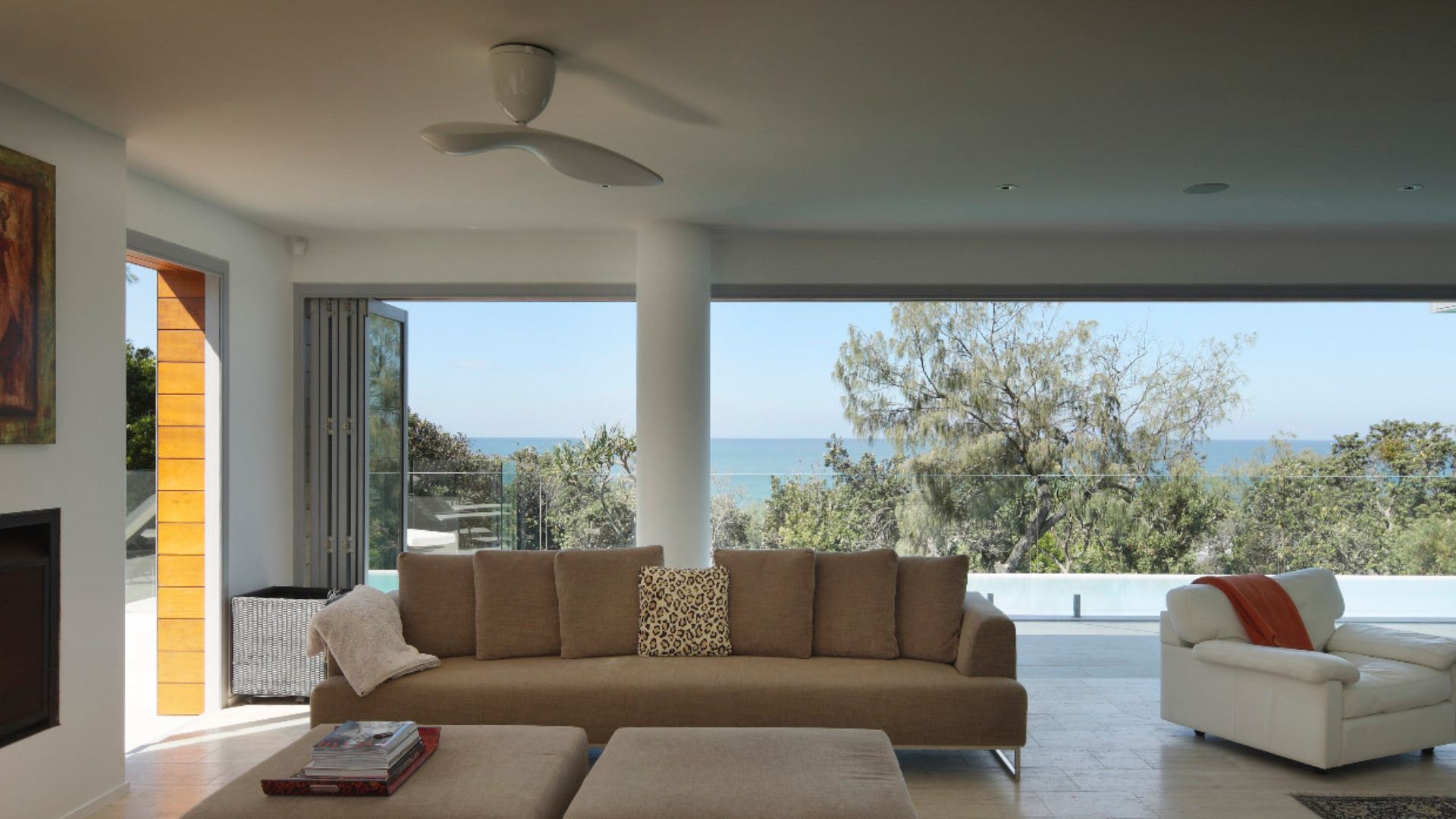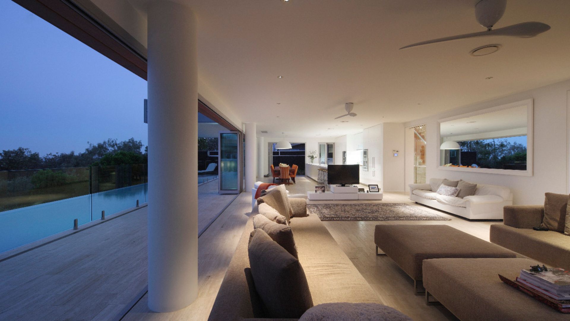 Sunshine beach house in Queensland was completed in late 2011 designed as a singular family home for its owner returning from overseas. Located on Sunshine coast’s longest and best surf beach with year-round sunny weather, the two-storey house with a partial lower level consists of 3 volumes. The house is designed with the sub tropical climate in mind as well as passive cooling and heating. Sandstone feature walls screen direct and guide visitors to the arrival as well as protect and screen. A “barcode” wall screens entrance from northerly neighbours and the solid walls run parallel forms the winter court to the bedroom block; other such walls screen and frame vignettes to the ocean from all bathrooms. Large seamless living and dining block runs north south facing out to the easterly (ocean) view opens out onto a sundeck and pool absorbing dramatic Noosa sunrise and Pacific Ocean. Large expanses of decks to the North and roof top allow for entertaining guests all year round. All sundry spaces and hallways are designed to attain natural daylight and a hierarchy of alcoves to display owner’s extensive South East Asian art and sculpture collection.